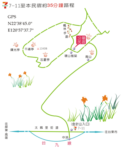 | 北下:台九線(山線)→台東→太麻里→金針山樓牌-轉東64道→產業道路→金針山. 南上:台九線(山線)→大武→太麻里→金針山樓牌-轉東64道→產業道路→金針山 *沿途有標示,請依標示前進。 | ||||||||