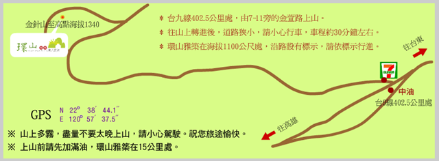 | 北下:台九線(山線)→台東→太麻里→金針山樓牌-轉東64道→產業道路→金針山. 南上:台九線(山線)→大武→太麻里→金針山樓牌-轉東64道→產業道路→金針山 |